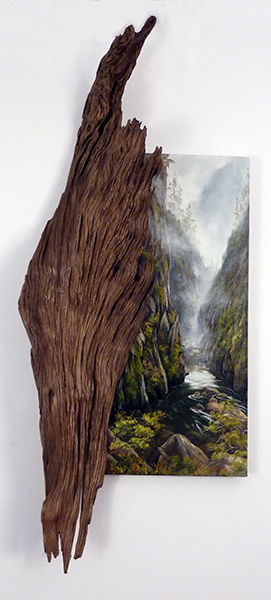 "Karangahake Gorge - Stumped".....Oil on canvas, Driftwood.....NZ$795.....120cm x 52cm